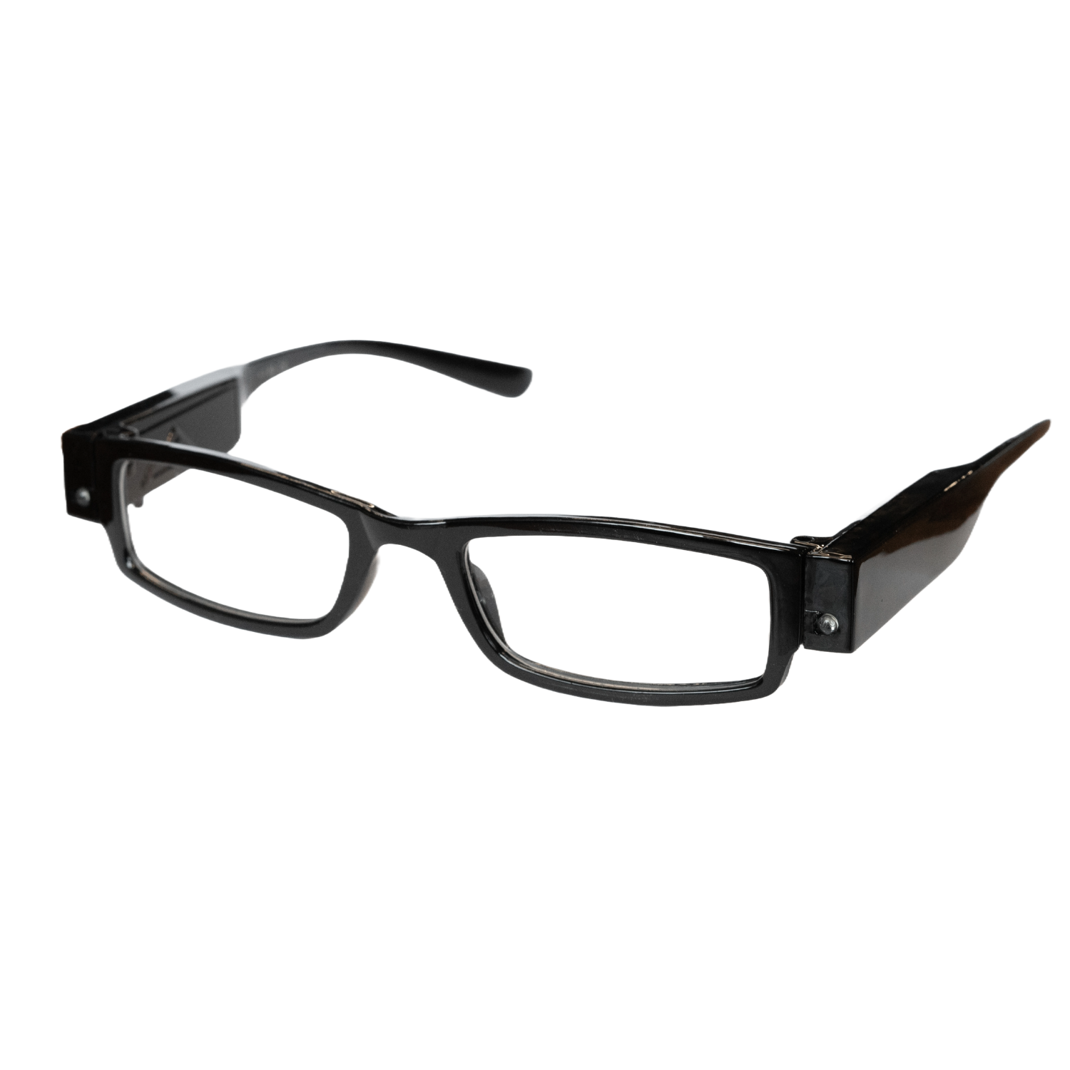 Læsebrille fra SEE-CARDT i sort firkantet letvægts stel af plastik. Batteridrevet LED lys integreret i begge sider af stellet.